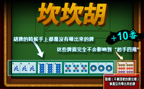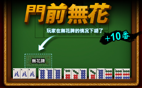 - 胡牌的時候,手上沒有碰出來的牌。暗槓也算是沒碰出來的牌。(+10番)