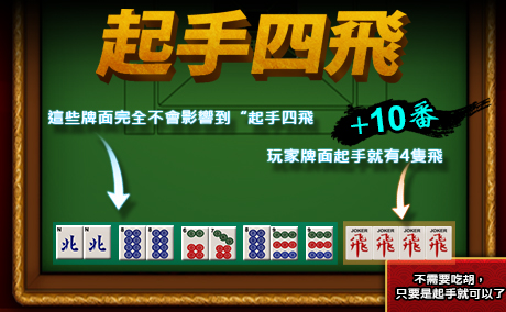 - 玩家在起手時就有四隻飛。其餘的牌面不會影響到“起手四飛”,因此不需吃胡,只要起手就可以贏了。(+10番)