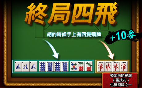 - 胡牌的時候手上有四隻飛。被頓出來當花牌的飛牌也算在內。(+10番)