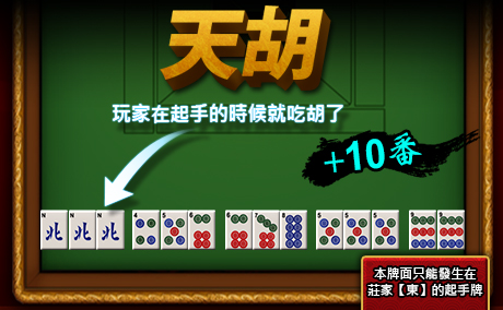 - 玩家在起手的時候就胡了。不過,此牌面只能發生在莊家(東)的起手牌。(+10番)
