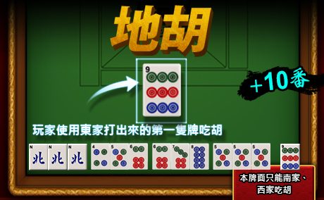 - 使用莊家(東)所打出來的第一張牌吃胡。本牌面只能發生在南家或西家。(+10番)