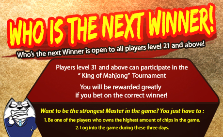 "Whos the Next Winner" is open to players who are in level 21 or above. Players level 31 and above can take part in the "King of Mahjong" Tournament.