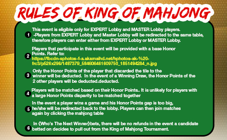 1. This event is open only to players of Expert Lobby or Master Lobby. Players must be in level 31 or above. - The players of Expert Lobby and Master Lobby will be directed to the same table. Therefore, players can enter from either the Expert Lobby or the Master Lobby. 2. Players who participate in this event will be given a base Honor Points. 3. Only the Honor Points of the player who discarded the tile to the winner will be deducted. In cases where players win by themselves (self game), the Honor Points of the other 2 players will be deducted. 4. Players will go through a matchmaking process base on their Honor Points. If the difference of Honor Points between the players is huge, it is very unlikely for them to play in the same match. 5. In the case whereby the player has won the game and thus his/her Honor Points has increased to a point where the difference is too big, he/she will be directed to the lobby room. Players can look for another match by clicking the Mahjong tables again.